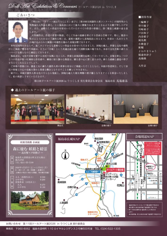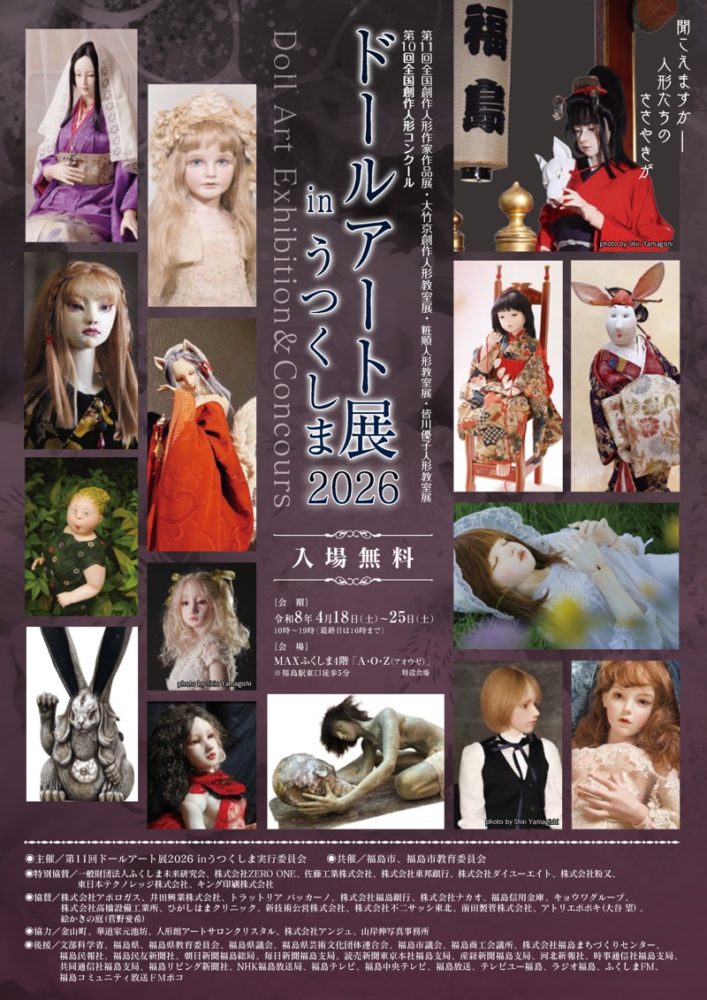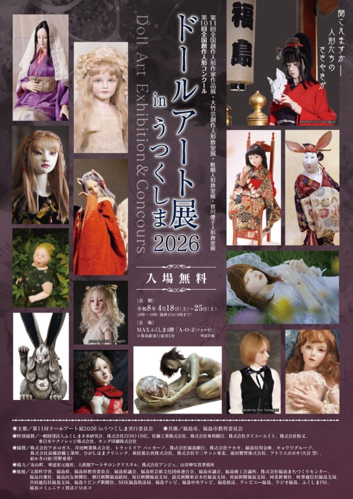 ドールアート展 in うつくしま2026 ドールアート2026_A4チラシ 会場 MAXふくしま4階「 A・O・Z(アオウゼ)」 開催日時 令和8年4月18日(土)~25日(土) 10時~19時(最終日は16時まで) 入場料 入場無料 開催場所 福島県福島市曽根田町1番18号 MAXふくしま4階 MAP Share: Twitter Facebook